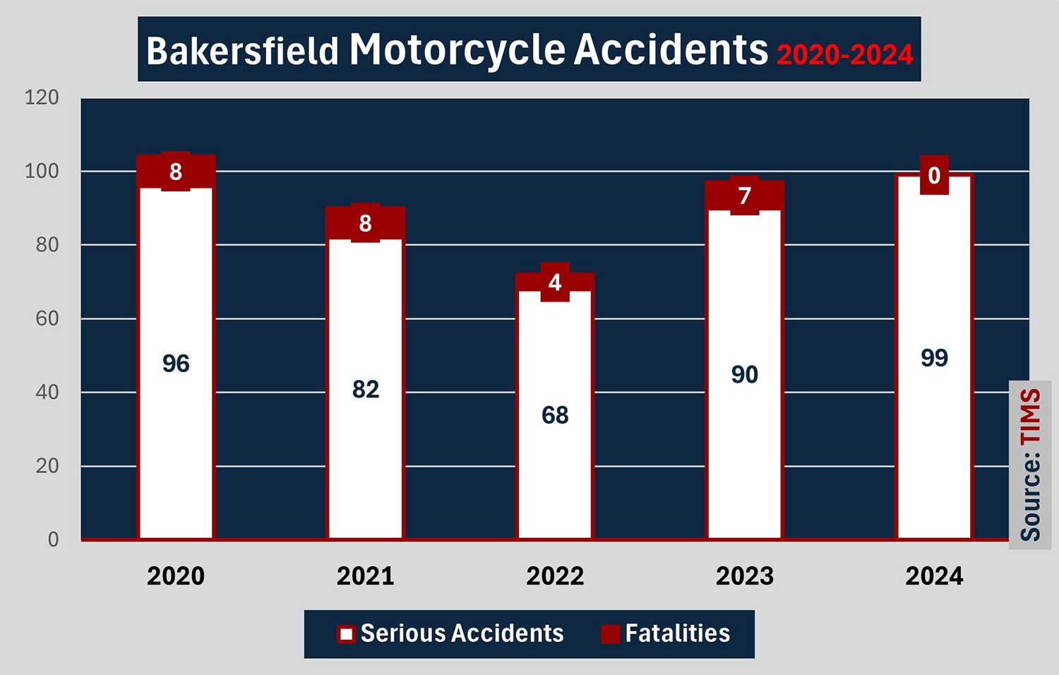 In 2024, Bakersfield recorded 99 serious motorcycle accidents, and thankfully, no fatalities. Unfortunately, 2023 had fewer accidents but many more fatal outcomes. 2023 brought 90 serious motorcycle accidents and at least 7 deaths.