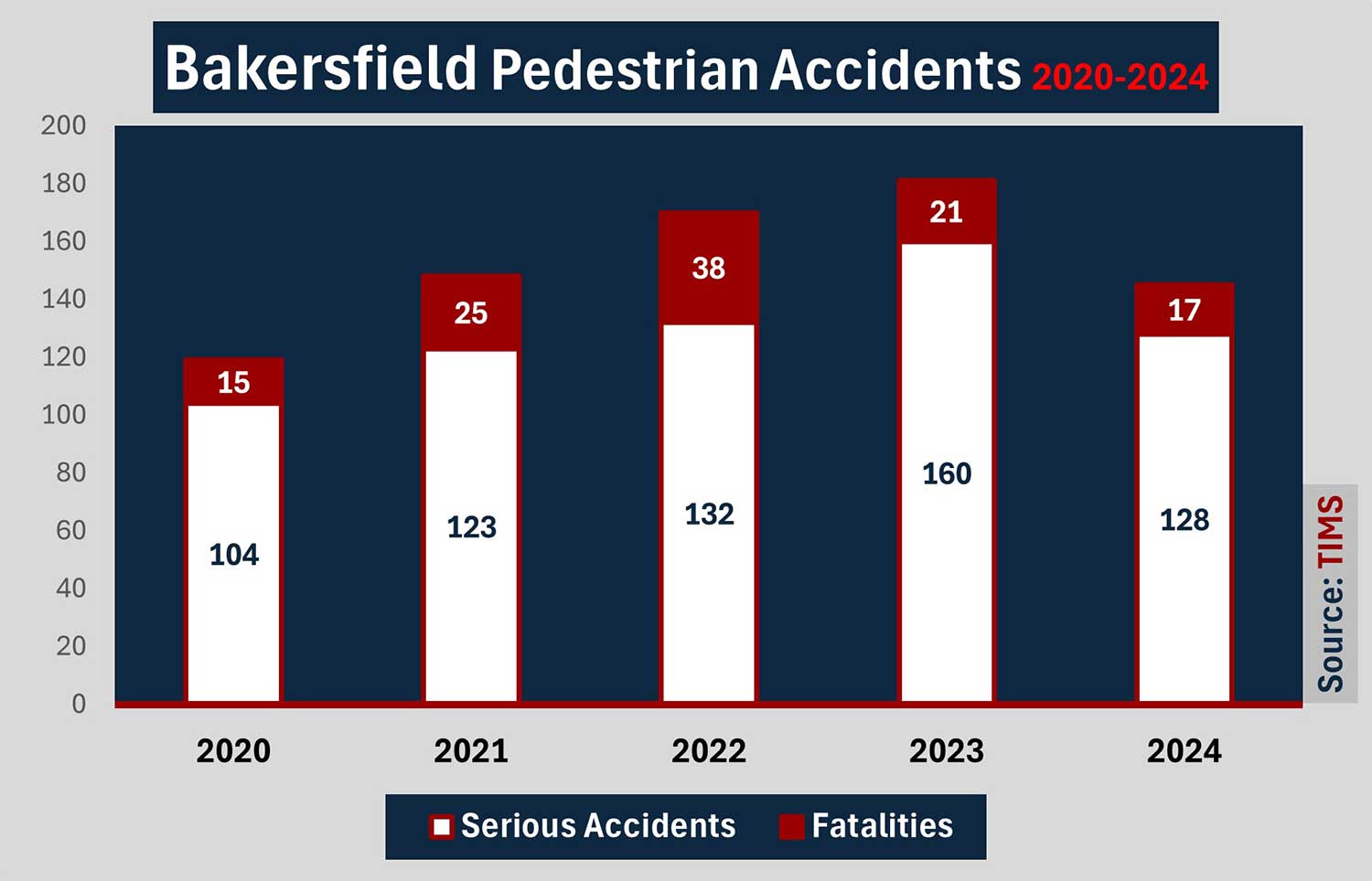 In 2024, Bakersfield recorded 128 serious pedestrian accidents and at least 17 deaths on our roads.